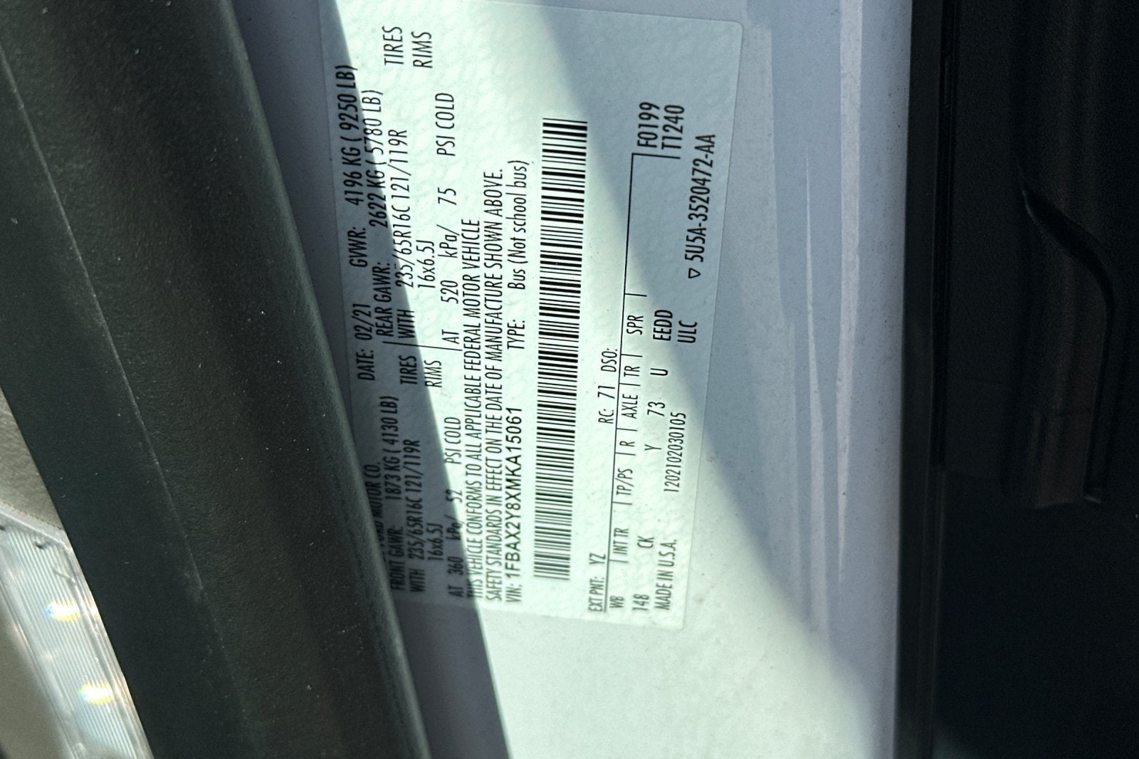 Oxford White 2021 Ford Transit-350 XLT 12 Passenger RWD 10-Speed Automatic with Overdrive V6 Catalytic Converter Theft Deterrent Stamp, 12 Passenger, One Owner, Clean Carfax, 2-Passenger Seats w/Add. Rear Seat Attachment Points, 3.73 Axle Ratio, 3rd row seats: split-bench, 4-Wheel Disc Brakes, 4th-Row Bench Seat, 8 Speakers, 8 Speakers (4 Front/4 Rear), ABS brakes, Air Conditioning, AM/FM radio, Auto High-beam Headlights, Brake assist, Builder's Prep Package, Cloth Front Bucket Seats, Delay-off headlights, Driver door bin, Driver vanity mirror, Driver's Seat Mounted Armrest, Dual front impact airbags, Dual front side impact airbags, Electronic Stability Control, Exterior Parking Camera Rear, Front anti-roll bar, Front Bucket Seats, Front License Plate Bracket, Front reading lights, Front wheel independent suspension, Fully automatic headlights, Illuminated entry, Low tire pressure warning, Modified Vehicle Wiring System, Occupant sensing airbag, Order Code 302A, Overhead airbag, Panic alarm, Passenger door bin, Passenger seat mounted armrest, Passenger vanity mirror, Power door mirrors, Power Running Boards, Power steering, Power windows, Privacy Glass, Radio: AM/FM Stereo w/HD/SiriusXM & 8 Screen, Rain sensing wipers, Rear air conditioning, Rear window defroster, Remote keyless entry, Steering wheel mounted audio controls, SYNC 3 Communications & Entertainment System, Tachometer, Telescoping steering wheel, Tilt steering wheel, Traction control, Variably intermittent wipers, Wheels: 16 Silver Aluminum Alloy.